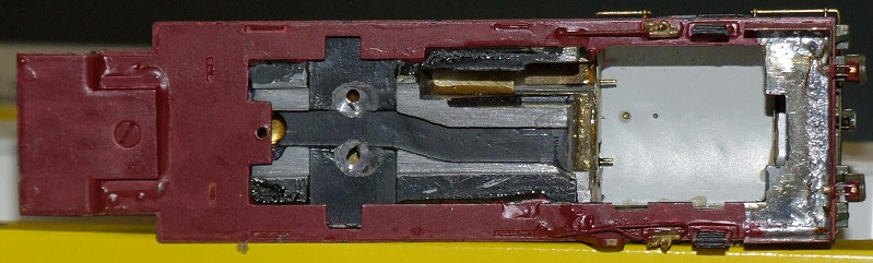 Der Lokaufbau aus Messing ist sehr leicht. Also habe ich das alte Ballaststück von Flm wieder eingebaut. Da der Einbauraum deutlich kleiner ist als bei der ehemaligen 64er, waren etliche Fräsarbeiten zu leisten.