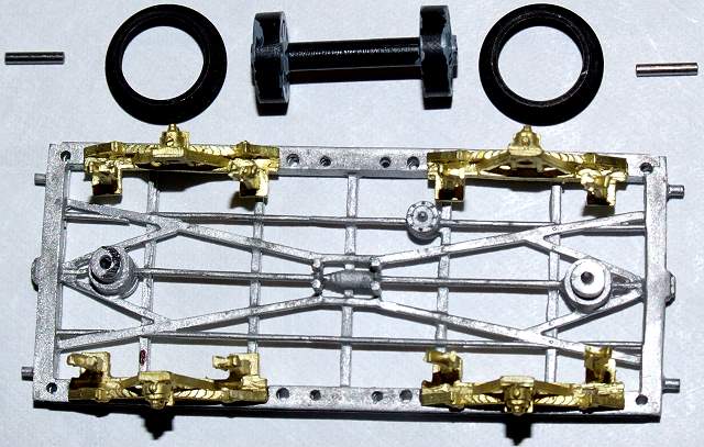 Radachsen und Radsterne sind aus schwarzem Kunststoff. Als Achsenden werden kleine Eisenbolzen in die Kunststoffachsen eingeschoben. Die Radreifen wurden aus Messing gedreht und brüniert. Das Untergestell besteht aus Hartzinn und die Achshalter, Radlager, Federn, Aufhängung und Bremsen sind in Messing gegossen. | |