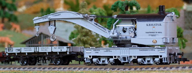 Das untenstehende Bild fand ich im Angebot eines Auktionshauses. Es zeigt einen Dampfkran mit einem Arbeitswagen der KBayStsB. Das Modell reizte mich sehr. Meinen an sich sehr korrekten Preiserlein erzählte ich, dass die Bayern neben dem Kauf der Baldwin Maschinen S2/5 und EI auch Interesse an einem amerikanischen Dampfkran gezeigt hätten. Das muss als Legitimation reichen. Der Bausatz ist sehr fein detailiert und außerordentlich passgenau. Nicht ganz einfach ist das Anbringen der Seilführung für den Boom. |