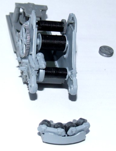 Ein Blick auf das Innere des Kranes. Gut zu erkennen ist die eingebaute Hebelbank. Ebenso sieht man auf diesem Bild in der Mitte des Auslegers die großen Seilscheiben, über die die Seile zum Heben und Senken des Armes laufen. Wenn es einem einmal gelingt, gleichzeitig das Seil über beide Seilscheiben zu führen (Geduldsspiel), dann sollte man es dort z.B. mit Mattlack fixieren. Die im Stehkessel stehende Seiltrommel dient zum Heben und Senken des Arms. Hat man das Seil aber auf den großen Seilscheiben fixiert, ist diese Seiltrommel natürlich ohne Funktion.
