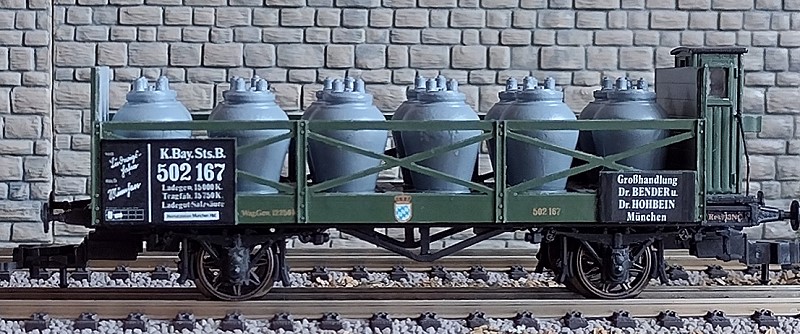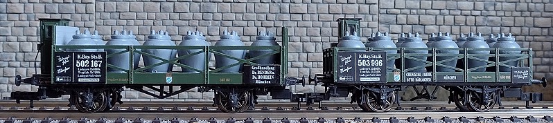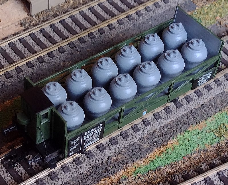 ![]() Hier nun beide Säuretopfwagen im Verband - jedoch von der anderen Seite gesehen. Nunmehr ist bei dem kurzen Säuretopfwagen auch der elfte Säuretopf erkennbar.