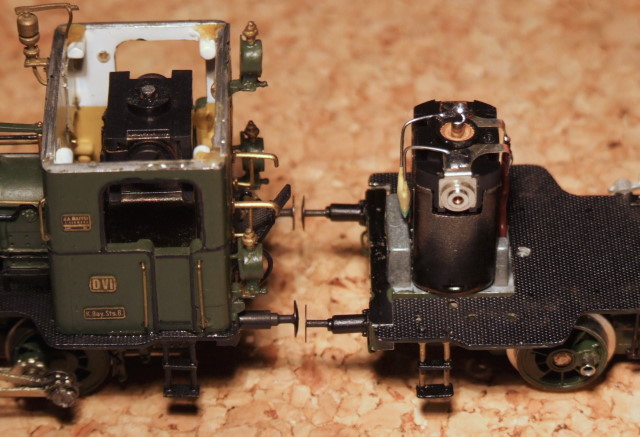 Der von DJH gelieferte Motor (links) ist deutlich größer als der m&f Motor. Um die Motorachse nicht zu behindern, musste sogar etwas Material im Führerhausdach herausgearbeitet werden.