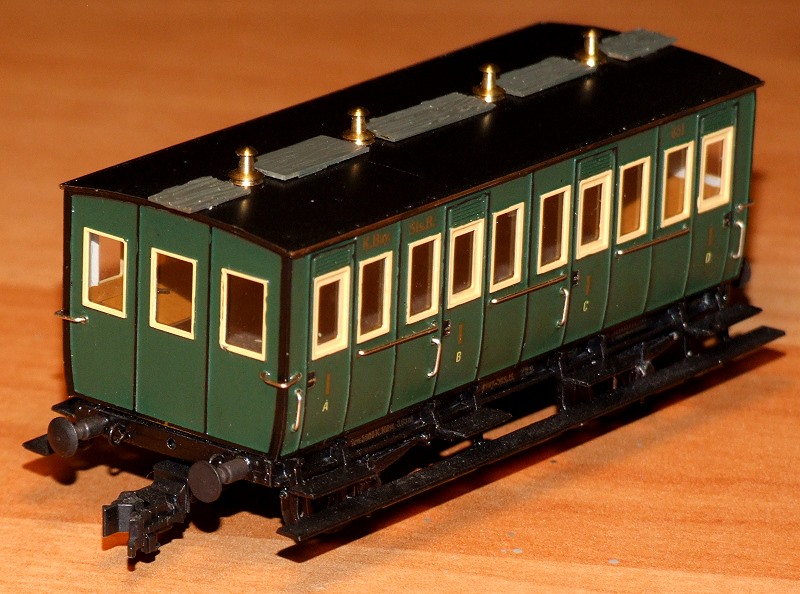 Inzwischen sind Handgriffe und Handläufe angebracht. Die Fensteröfnungen haben Scheiben erhalten. Laufbretter und Abgashutzen der Gasbeleuchtung haben ihren Platz gefunden. Besonders schwierig gestaltete sich das Anbringen der kurzen Handläufe an den Wagenecken.