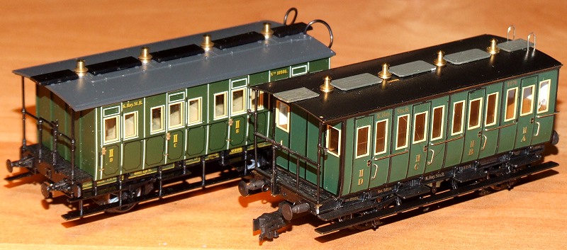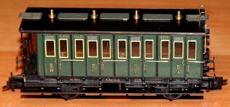 Hier ein II.-Klasse-Wgen der Firma Trix zum Vergleich. Auffällig sind beim M+F Modell die beiden Fensteröffnungen zur Bremserbühne.
