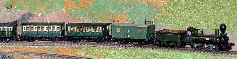 Eingereiht in einen Zug, der aus Abteilwagen gebildet ist. Den Zug zieht die B VI "Tölz". Ungewöhnlich ist die Tatsache, dass der Torf, mit dem die Lok beheizt wird, in einem offenen Tender mitgeführt wird. Normalerweise sind Torftender geschlossen, um den Brennstoff vor Feuchtigkeit zu schützen.