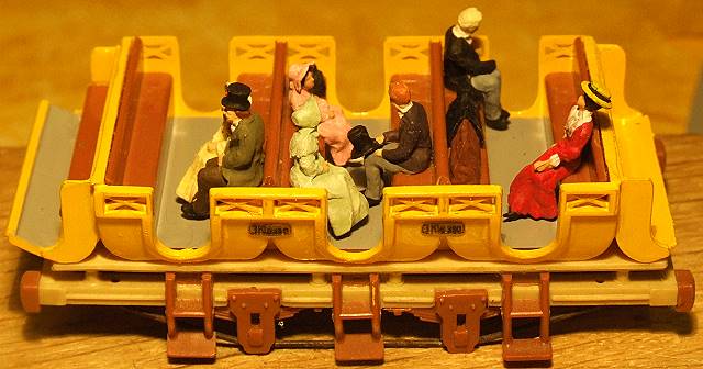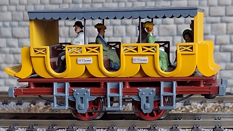 Im ersten Betriebsjahr waren mehrere Wagen dieser Bauart in den Wagenzug eingestellt, wie es ist auf vielen Bildern und Skizzen mit der Darstellung der Eröffnungsfahrt zu sehen ist. Allerdings erhielten diese Wagen bereits 1836 ein Verdeck. Als Ausgangsmaterial dienten uralte seitlich offene 3. Klasse-Wagen der LEB von Trix Express, die schon starke Beschädigungen aufwiesen. |