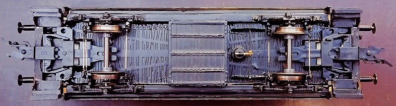 Das Fahrgestell des Durchgangswagens. Die Federpuffer (s.u.), Teile der Achshalter und Treppenstufen müssen noch eingefärbt werden.