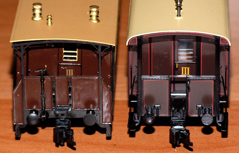 Rechts im Bild ist ein vergleichbarer Wagentyp aus kommerzieller Fertigung der Firma Trix zu sehen. Der linke Wagen ist niedriger und weist ein flacheres Dach auf. Somit dürfte der rechte Wagen der modernere Typ sein.