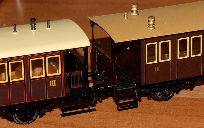 Hier ist deutlich zu sehen, dass die Kurzkupplungen ein Puffer an Puffer Fahren ermöglichen. Links der Wagen von Trix. Weitere Unterschiede sind zu erkennen: Der Wagen von Trix hat weniger tiefe Fenster. Der Wagen von Merker und Fischer weist eine zusätzliche untere Trittstufe auf. Das deutet darauf hin, dass einige Bahnsteige sehr niedrig waren oder sich kaum über die Schwellenoberkante erhoben haben.