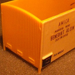 Der Kunststoff des Wagenkastens ist mit der ürsprünglich landbuttergelben Farbe nur sehr zart eingefärbt, so dass der Wagenkasten einen sehr durchscheinenden, plastikhaften Eindruck hinterlässt (Stirnseite links). Die Längseite ist bereits mit einem helleren seidenmatten Farbton versehen..