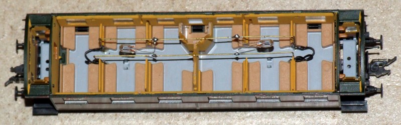 Links ist zu erkennen, wie der Strom für die Innenbeleuchtung von den Radachsen abgenommen wird. Als Schleifer findet 0,3mm starker Bronzedraht Verwendung. Litze führt den Strom durch die Einklippsöffnung der Drehgestelle ins Wageninnere.