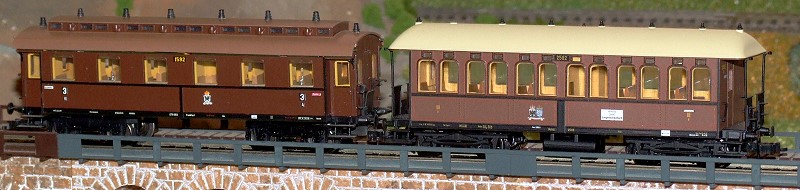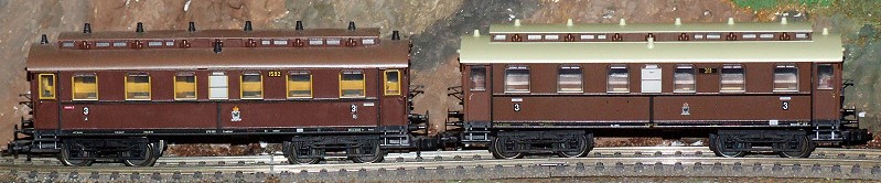 Hier zwei Sitzwagen dritter Klasse aus unterschiedlichen Bauserien: links der C4iPr15 dritte Bauserie und rechts C4iPr91 erste Bauserie (Liliput L351000).