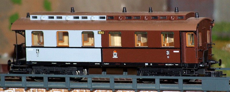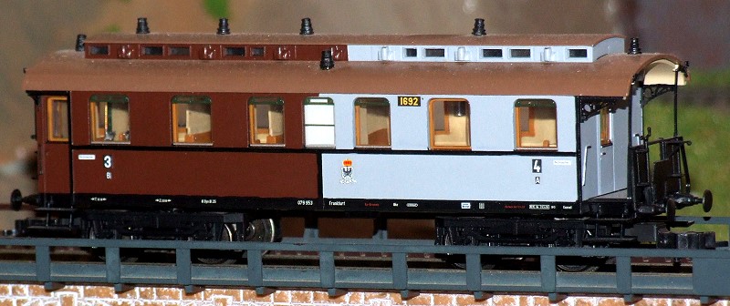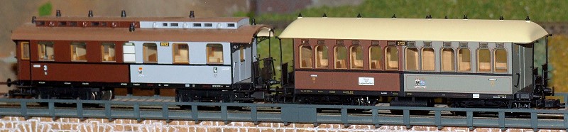 Hier zwei Sitzwagen dritter und vierter Klasse aus unterschiedlichen Bauserien: links der CD4iPr14 dritte Bauserie und rechts CDiPR07 (CD4iPr91) erste Bauserie (Liliput L351000). Die Doppelfenster des rechten Wagens weisen auf die erste Bauserie hin. Zu dieser Zeit gab es aber keine vierte Klasse. Die vierte Klasse wurde auf der Strecke Wiesbaden - Langenschalbach erst um 1907 eingeführt. Also dürfte es sich hier um einen Umbauwagen handeln.