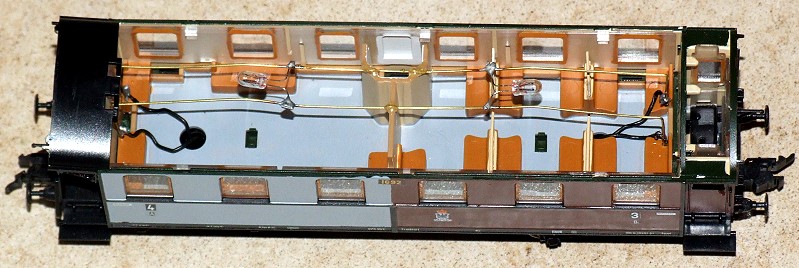 Die Inneneinrichtung entspricht der Klasseneinteilung des Wagens. Trennwand und Toilettenwand reichen aus, um die Messingdrähte für die Beleuchtung sicher zu befestigen.
