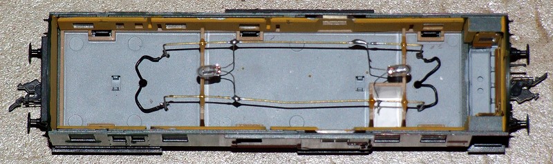 Links ist zu erkennen, wie der Strom für die Innenbeleuchtung von den Radachsen abgenommen wird. Als Schleifer findet 0,3mm starker Bronzedraht Verwendung. Litze führt den Strom durch die Einklippsöffnung der Drehgestelle ins Wageninnere.