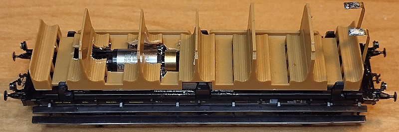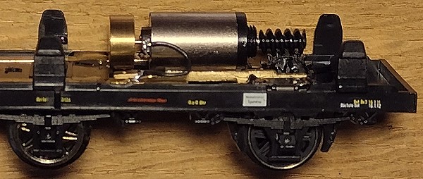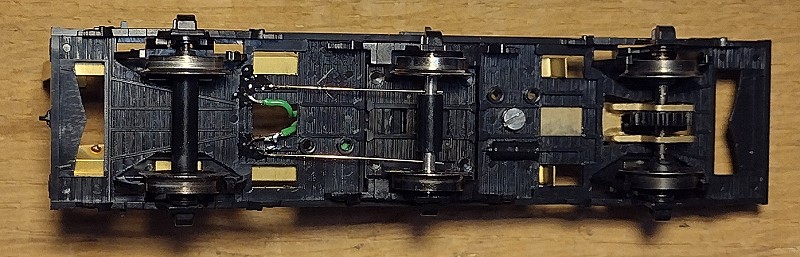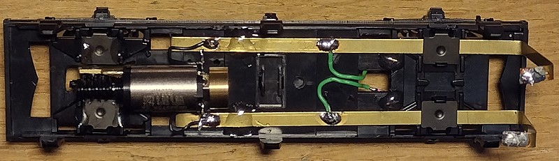 ![]() Die Bodenplatte von unten. Es ist gut zu erkennen, wie die mittlere Achse über Bronzefederdrähte mit zur Stromversorgung herangezogen wird. Beim linken äußeren Radsatz erfolgt die Stromaufnahme über die Achslager.