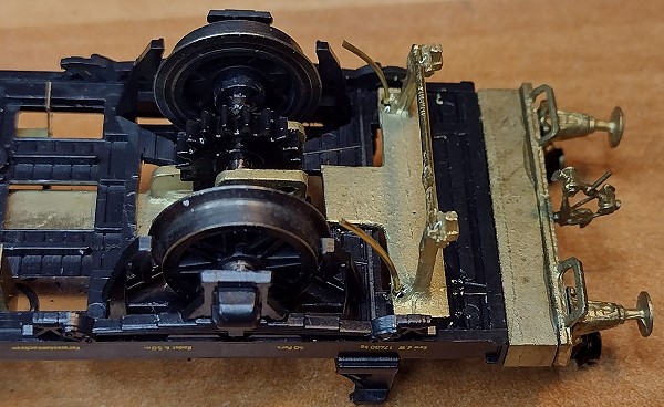 ![]() Diese Teile aus Messing werden zusätzlich angebracht: Schienenräumer und Sandfallrohre, sowie Verlängerung des Fahrgestells mit Kupplungsattrappe, Puffern und Rangiergriffen.