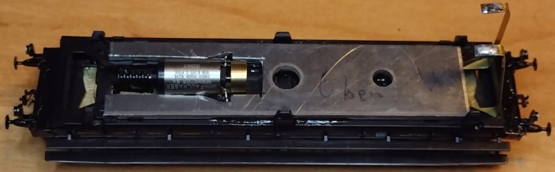 ![]() Der Boden mit den Laufbrettern und die Ballastplatte sind nun eingebaut.Die leicht verschiebbare Ballastplatte wurde mit dem Kunststoffboden fest verklebt, um mögliche Kurzschlüsse an der Stromeinspeisung des Motors zu vermeiden.