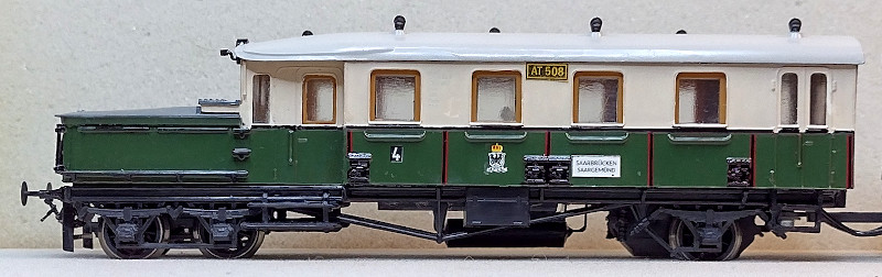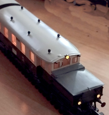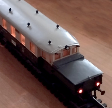 ![]() Der Triebwagenteil dritter Klasse. Auf diesem Bild ist der doppelte Radsatz unter dem Vorbau gut zu erkennen.