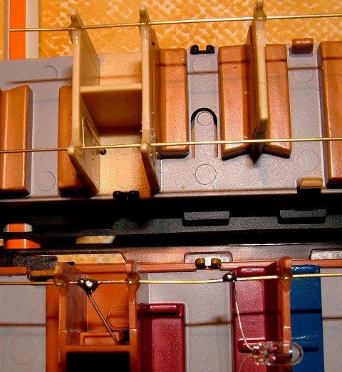 Die Haltedrähte für die Glühlämpchen werden oben an den Abteilzwischenwänden mit Uhu-plus 5min festgeklebt.