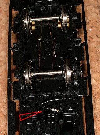 Hier ist die Stromaufnahme vom Drehgestell gut zu erkennen. Oberhalb des Drehgestells wird der Strom über eine im Zickzack gebogene dünne Litze bis unter die Toilette geführt (roter Pfeil). Ach ja, bei den Radsätzen handelt es sich natürlich nicht um die Originale von Piko (die sind ja beidseitig voll isoliert), sondern um einseitig isolierte Radsätze von Sachsen-Modelle. Dass dies keine Speichenradsätze sind, fällt bei den großen Drehgestellwangen kaum auf. | |