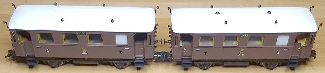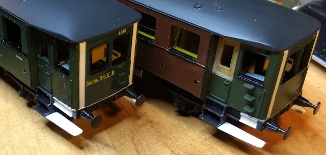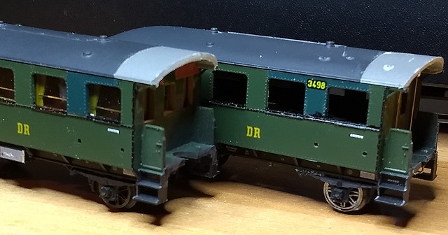 Die Dachlüfter stammen aus dem Zubehör für vierachsige Abteilwagen von Piko. Der verwinkelte Rauchabzug entstand aus Kupferdraht und Lötzinn. Die dachförmige Abdeckung für den Rauchbabzug habe ich aus sehr dünnem Messingblech gefertigt. Der Balgen für die beiden Dächer wurde aus einem Dachrest von Wagen 3 zurechtgefeilt. Damit es beim Befahren von Weichenstraßen keine Probleme gibt, müssen die Enden des Balgen noch etwas eingezogen werden. |