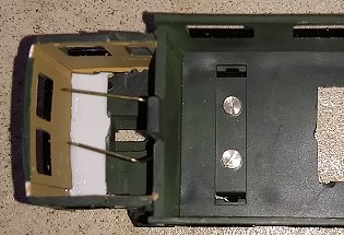 Eine feste vorbildgerechte Kupplung der beiden Wagenteile würde in Weichenstraßen zur Entgleisung führen. Also muss eine bewegliche Kupplung her. Für eine kulissengeführte Kurzkupplung fehlt der Platz zum Einbau. Lösung: Ein Messingstreifen mit einem Langloch. Am "Motorwagen" wird er mit einer Schraube, die am Einachsantrieb befestigt ist, verbunden. Später wird er mit einer fixierten Mutter gesichert. Am anderen Wagenteil greift eine Schraube in das Langloch desMessingstreifens. Eine lange Feder, die am Messingstreifen befestigt ist, ermöglicht ein "Puffer-an-Puffer-Fahren". |