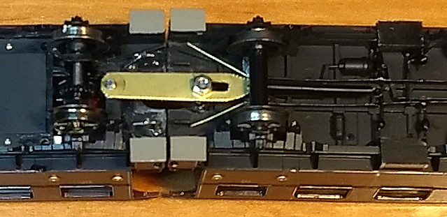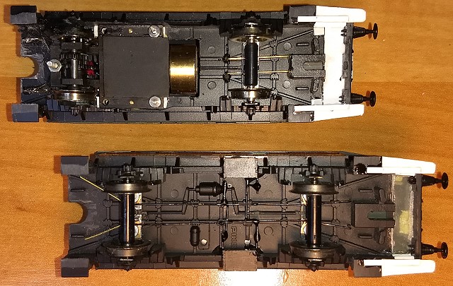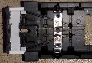 ![]() Hier die beiden Wagen von unten. Die Betriebsspannung wird von den zuvor geteilten Achslagern aufgenommen.