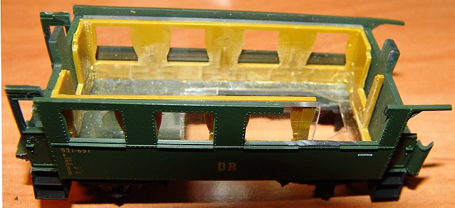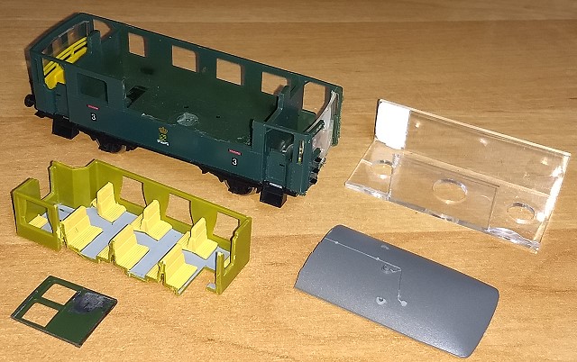Dieser Windbergwagen hat auch schon viele andere Teile eingebüßt. Der große Ausschnitt für den Motor im Wagenboden ist auch schon ausgefräßt. Aber woher nehme ich nun Fenster in der passenden Größe? |