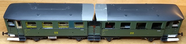 Er liefert auch die Fensterrahmen mit den Gardinen. Glasscheiben für die weiß gefärbten Toilettenscheiben muss er auch hergeben. Ebenso die Dachverlängerungen für das Triebwagenmittelteil. Ferner noch Ersatz für eine zerfräßte Frontpartie (im Bild unten links). |