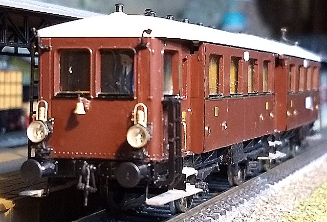 Akku-Triebwagen der KSächsStsEB von 1904. Erstellt aus Windberg-Aussichtswagen der Firma Piko. Von Weinert stammen der Einachsantrieb, die Laternen, die Glocken und die Kupplungsatrappen. Die Leitern habe ich von Roco ausgeborgt. Weitere Kleinteile habe ich selbst angefertigt oder von anderen Piko-Modellen übernommen. |