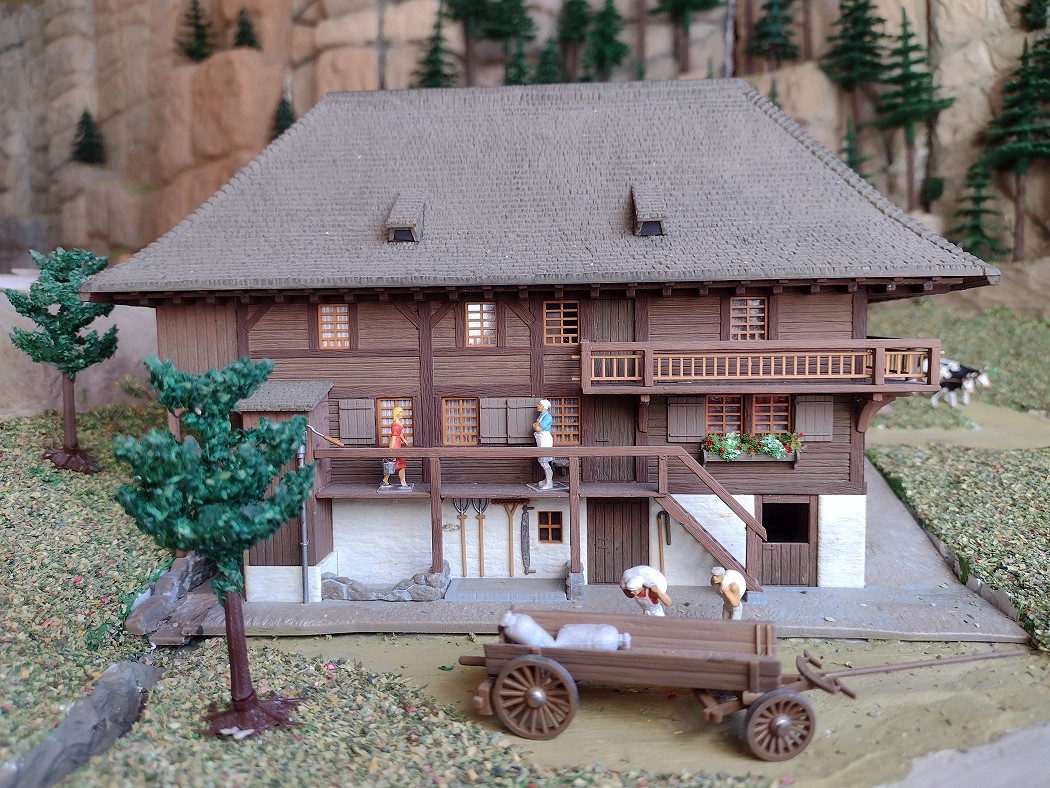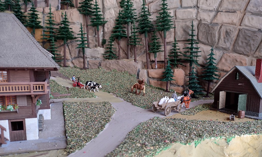 ![]() Gerade verlässt ein Fuhrknecht die Mühle mit einer Wagenladung Mehlsäcke. Bauer Hintermeier ist mit seiner defekten Mähmaschine unterwegs zur Schmiede. Nach einer kleinen Reparatur will er sofort zum Mähen.