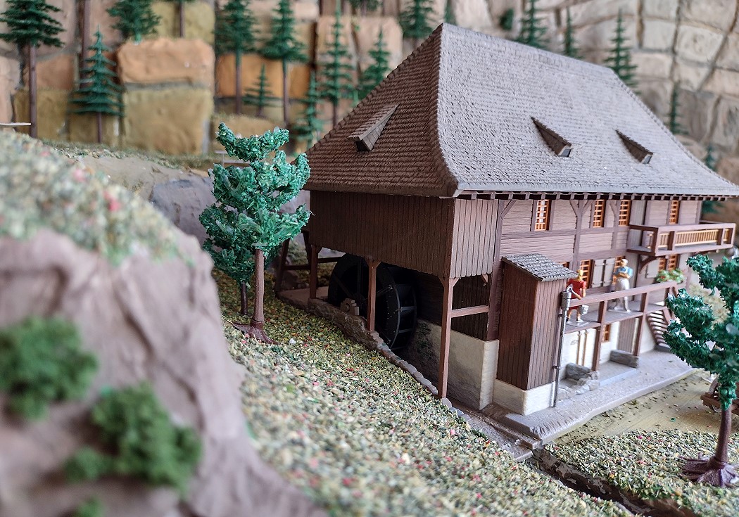 ![]() Mühle im Licht der untergehenden Sonne. Dem Mühlenteich fehlt noch das Wasser. Bäume warten noch darauf, dass sie gepflanzt werden. Die Wirtschaftsflächen links der Mühle befinden sich noch nicht in Kultur.