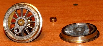 Ging leichter als gedacht. Im rechten Bild kann man die ausgebohrten Messingbolzen sehen, beziehungsweise das, was von ihnen übrig geblieben ist. Jetzt werde ich noch messen, ob wirklich keine elektrische Verbindung - etwa durch kleine Metallsplitter - zwischen Radreifen und Radstern besteht. Danach erhalten die Löcher eine Ausfüllung mit einem Zweikomponentenkleber. | |