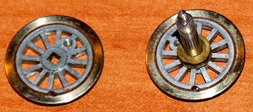 Recht eigenwillig ist die Anordnung der ausgleichenden Massen gestaltet. (linkes Bild) Die isolierten Räder (rechte Seite in Fahrtrichtung) sind in der Isolierung angebohrt und mit einem Messingstift versehen, so dass Radreifen und Radstern kurzgeschlossen sind. Das macht eigentlich nur Sinn, wenn man das Modell auf ein Dreileitersystem umbauen will. Weitere Ansätze zu einem solchen Umbau waren aber nicht zu erkennen. Wie bekommt man die Stifte nun wieder heraus? Ausbohren?