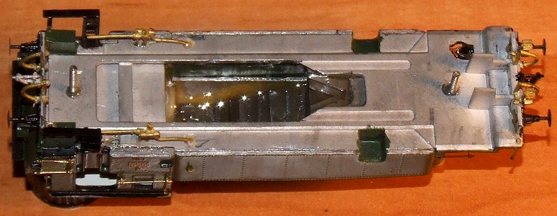 Das Lokoberteil ist vor allem im vorderen Teil mit reichlich Ballast versehen, damit das Hauptgewicht der Lok auf der angetriebenen Achse liegt.