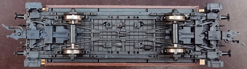 ![]() Die Bodenansicht zeigt die üblichen Änderungen mit Roco-Kurzkupplungsschächen und Roco Speichenradsätzen. Die Aufnahme des Stroms für die Beleuchtung erfolgt mit feinem Bronzefederdraht über die Radachsen.