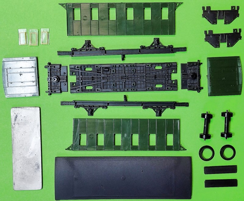 ![]() Aus diesen Teilen und weiteren Kleinteilen soll nun der Ci Wü 71 entstehen. Die Teile des Baussatz bestehen komplett aus Kunststoff. Einzige Ausnahme: die brünierten Radreifen aus Messing.