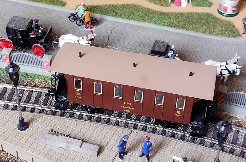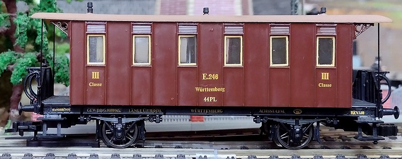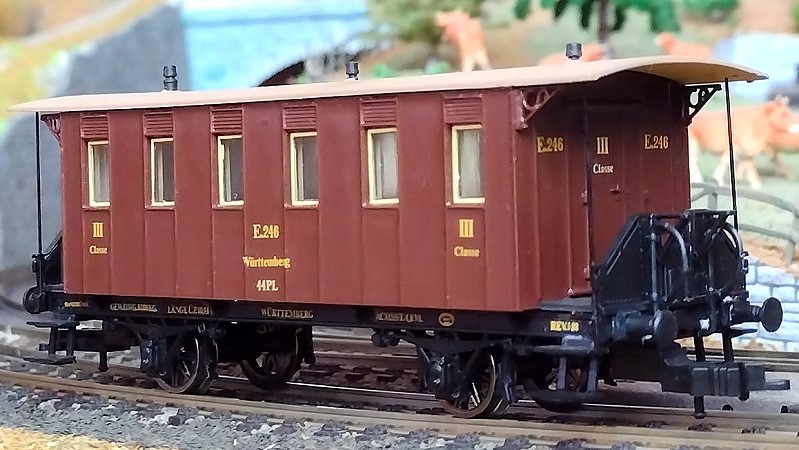 Angeboten wurde diese Wagenserie mit vier unterschiedlichen Modellen auch von der Firma Röwa. Wahrscheinlich hat Rai-Mo die Spritzgussformen von Röwa übernommen. Württemberg beschaffte überwiegend vierachsige Durchgangswagen. Die Zweiachser wurden für einzelne Nebenstrecken bzw. für verkehrsschwache Zeiten benötigt. Für diesen Zweck wurden aber überwiegend zweiachsige Abteilwagen eingesetzt. Die Datenlage für das vorliegende Modell ist recht dürftig. Hier handelt es sich um einen Durchgangswagen 3. Klasse der Königlich Württembergischen Eisenbahn. Dieser Wagentyp ist an jeder Außenwand mit sechs Fenstern ausgestattet. |